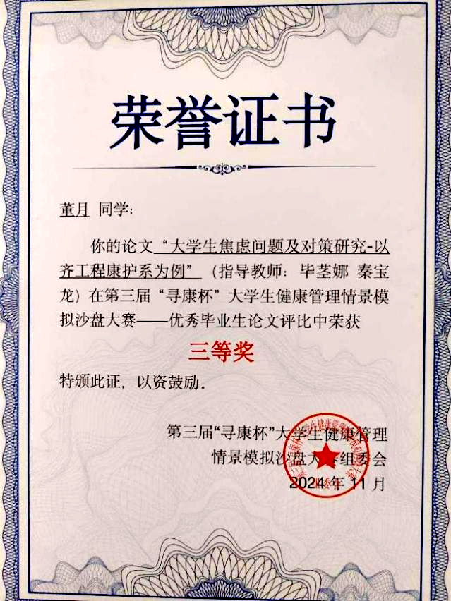 近日,第三届全国健康服务与管理专业优秀论文评比大赛传来喜讯,我校康护工程系健康服务与管理专业2024届学生董月的毕业论文《大学生焦虑问题及对策研究——以齐工程康护为例》获得三等奖。本届大赛在成都医学院举行,由中国老年医学学会指导、中国老年医学学会院校教育分会主办,旨在挖掘健康服务与管理领域的创新研究成果,提升健康服务与管理专业的教学质量和科研水平,全国多所高校参与。大赛成绩不仅展现了我校健管学子扎...