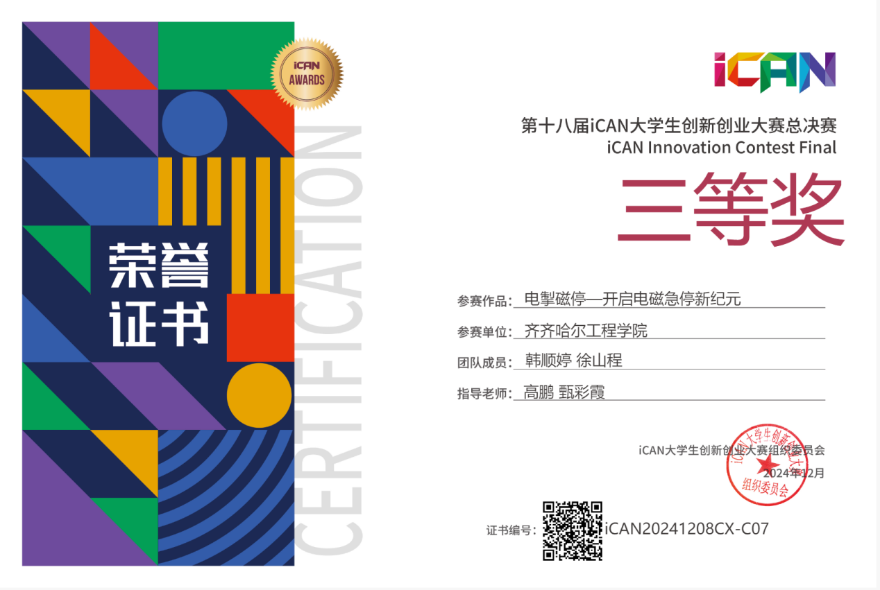 近日,iCAN大学生创新创业大赛组委会传来喜讯,我校机电工程系电气工程及其自动化专业韩顺婷、徐山程团队的“电掣磁停—开启电磁急停新纪元”项目,荣获全国总决赛三等奖。 12月8日,第十八届iCAN大学生创新创业大赛全国总决赛在山东农业工程学院(淄博校区)成功落下帷幕。本届大赛设创新、创业与挑战赛三个赛道,共吸引了32144个团队参加,覆盖高校1500余所,分赛区选拔后,800个优秀项目参加全国决赛。我校电气工程及其自动...