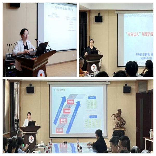 学校相关职能部门负责人张平、冯洁、任志新分别介绍了学校师资队伍建设、实践教学体系建设、专业法人制度建设等方面情况。