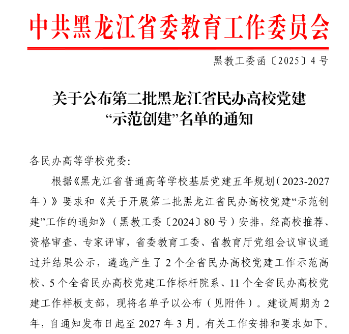 近日,黑龙江省委教育工委公布全省第二批民办高校党建“示范创建”评审结果,我校建筑管理工程系工程管理专业学生党支部获批党建工作“样板支部”培育创建单位。