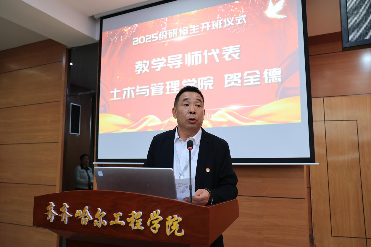 教学导师代表、土木与管理学院副院长贺全德从明确导师核心职责、依托产教融合基地,搭建校企导师合作新平台、科学合理地安排研修计划三个方面说明了未来教学方向。