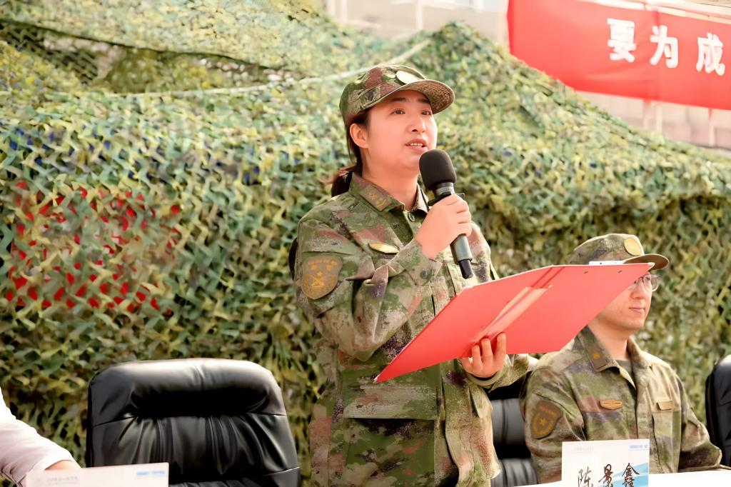 陈景鑫作总结讲话。她深刻阐述了军事训练对锤炼新生意志、培养优良品质的重要意义,并鼓励大家在训练中不怕苦、不怕累,将“亮剑”精神融入日常,为今后的学习与生活奠定坚实基础。