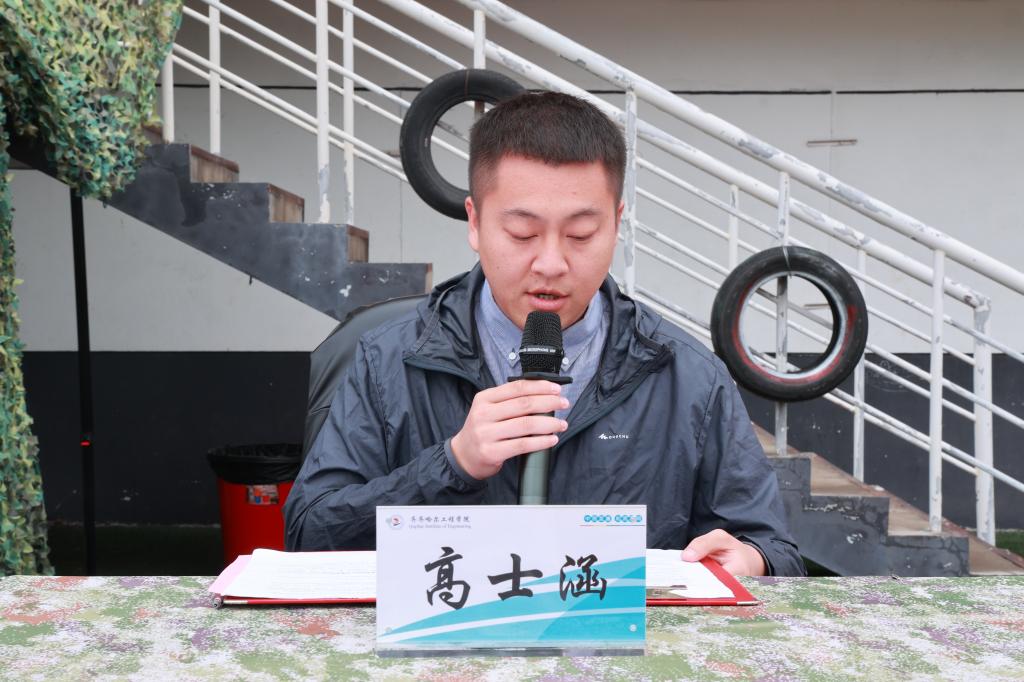 机电学院赵思博代表全体新生发言。他分享了对大学生活的憧憬与对军训的期待,希望全体新生以积极姿态迎接挑战,并用坚定的声音表达了克服困难、认真完成军训任务的决心。