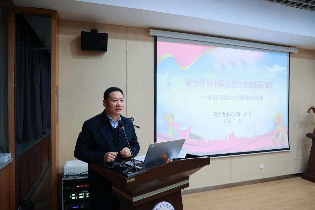 首先,马克思主义学院银龄教授高飞以“奋力开创中国式现代化建设新局面——学习贯彻党的二十届四中全会精神”为题作报告。报告既准确把握了全会精神的核心要义,又紧密联系学校发展实际,为与会人员进一步深化理解奠定了坚实基础。