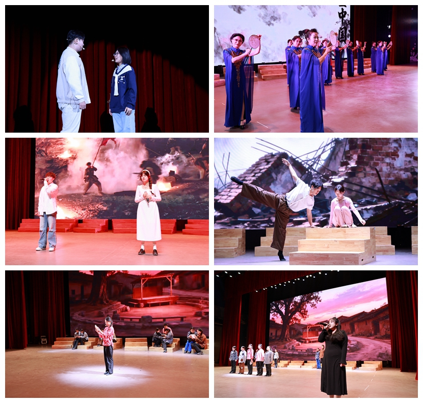 汇演以舞台剧的创新形式开篇,带领观众从当下“穿越”回往昔那段峥嵘岁月。民乐合奏《九儿》以悠扬的旋律,深情奏响民族觉醒的前奏;大学生艺术团声乐分团演唱的《错位时空(五四特别版)》,实现了一场跨越时空的青春对话,唤起全场观众的强烈共鸣。在“忆”的篇章中,舞蹈《乘风》再现了先辈们“以青春之我,创建青春之国家”的激昂热情;音乐剧《映山红》则通过动人的剧情与歌声,将革命年代的坚定信仰具象呈现。在“望”的主题中,舞蹈《风声》《殇》以肢体语言传递历史厚重与精神赓续;情景朗诵《祭黄帝陵文》字字铿锵,唤醒深植血脉的文化根脉;歌曲《岁月》与合唱《不要慌,太阳下山有月光》作为尾声,既诠释了岁月沉淀的深沉力量,也展现出青年一代向阳而生的蓬勃底气。整场演出中,舞台大屏上的历史画面与演员们的深情演绎交织,使爱国理念化为可感可知、直击人心的力量,有效引导广大师生在铭记历史中坚定“强国有我”的理想信念,涵养家国情怀。