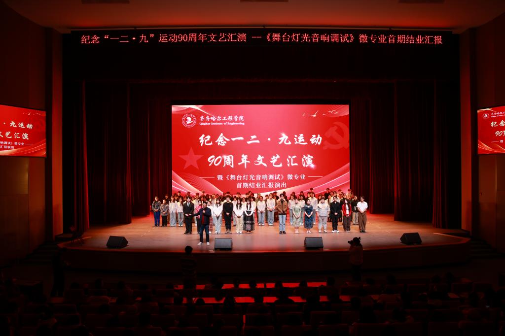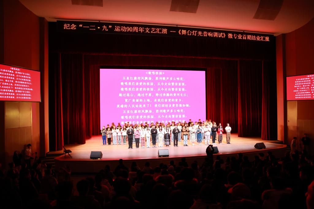 本次汇演是学校《舞台灯光音响调试》微专业教学成果的一次集中检验与特色展示。从汇演的整体策划、节目编排,到灯光设计、音响调控及现场调度,均由微专业学生团队主导完成。这不仅是专业技能的一次“实战”考核与教学成果的生动展现,更是一次深刻的团队协作历练。青年学子们将课堂所学应用于真实的舞台创作,并在艺术实践中深化了对“一二·九”精神的理解,深刻感悟到历史进程中青年先锋的责任与担当。这一过程,生动诠释了新时代青年将个人成长融入国家发展的奋进姿态,极大地激发了在场学子为民族复兴贡献青春力量的决心。