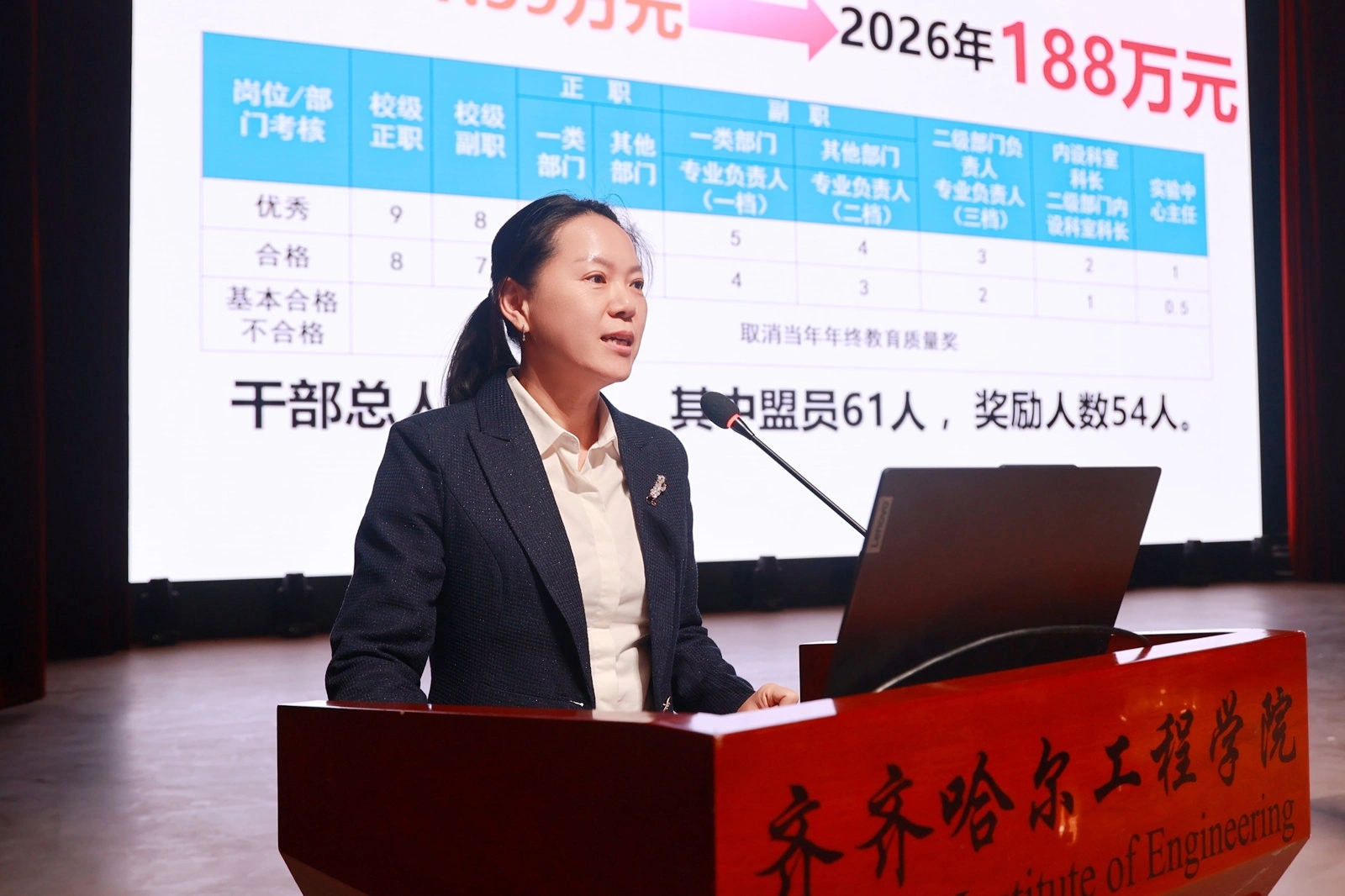 人事处处长张莹就“优劳优得”的奖励机制及干部盟员各岗位分配情况作了干部业绩奖励工作汇报。她指出,“干部业绩奖”的奖励导向聚焦于工作实绩,与资历、经验无关,不唯学历、不唯年限,真正以实际工作成果作为评定核心依据。