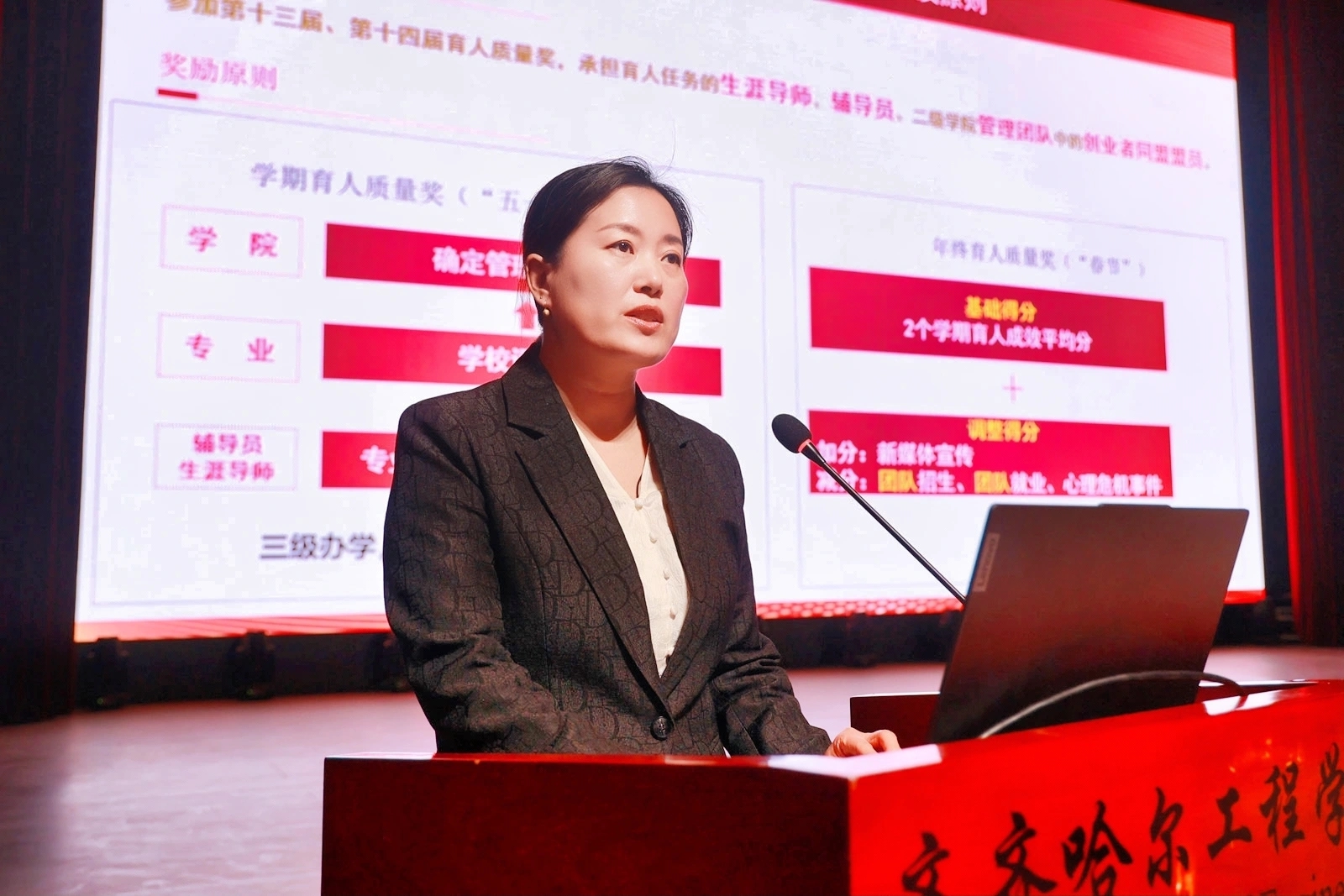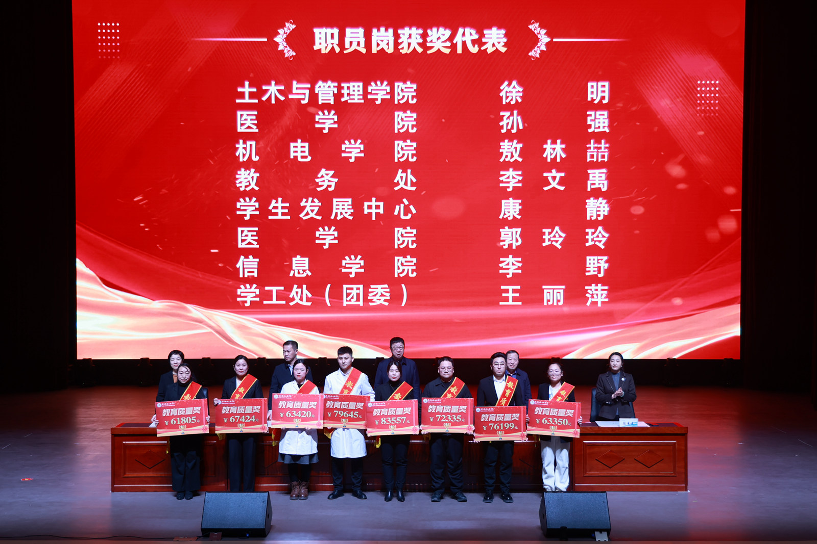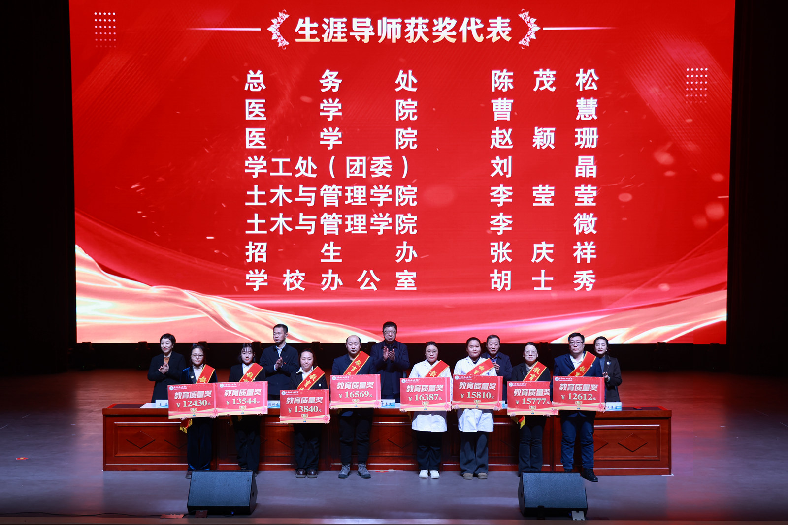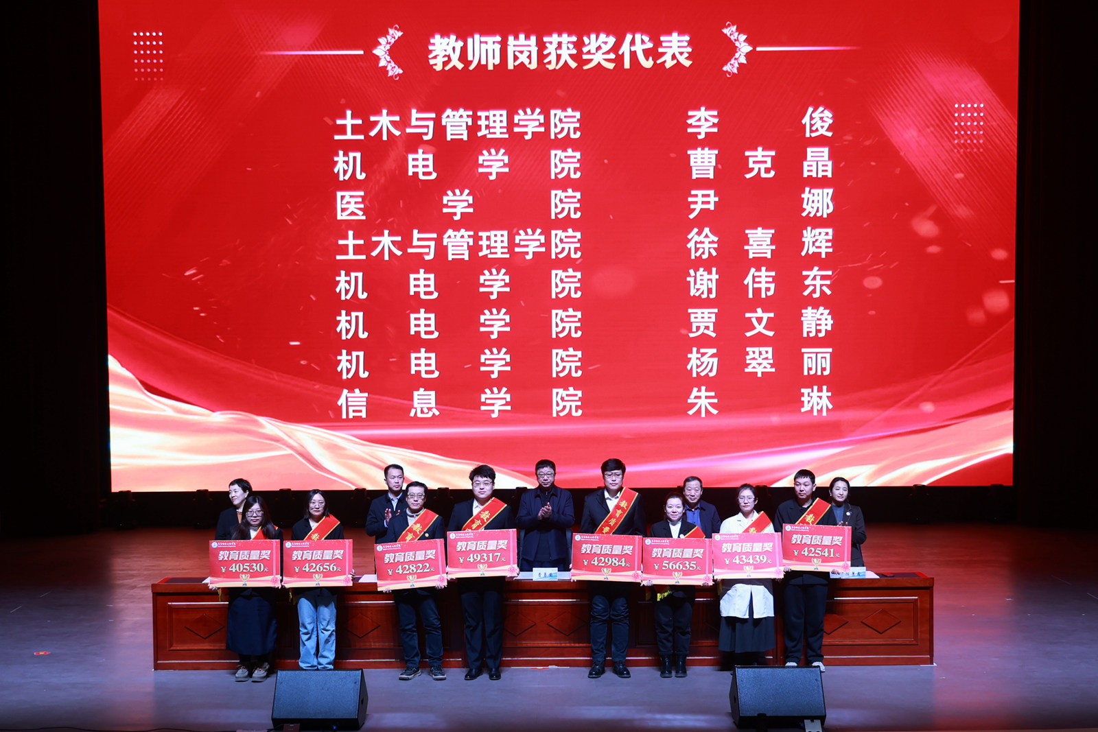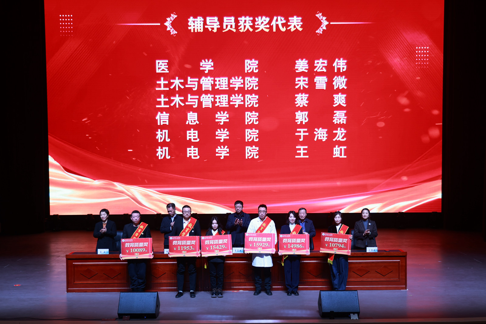 在热烈的掌声中,学校领导依次为获奖教师代表颁奖,表彰他们在教学改革、育人实践中取得的突出成绩。