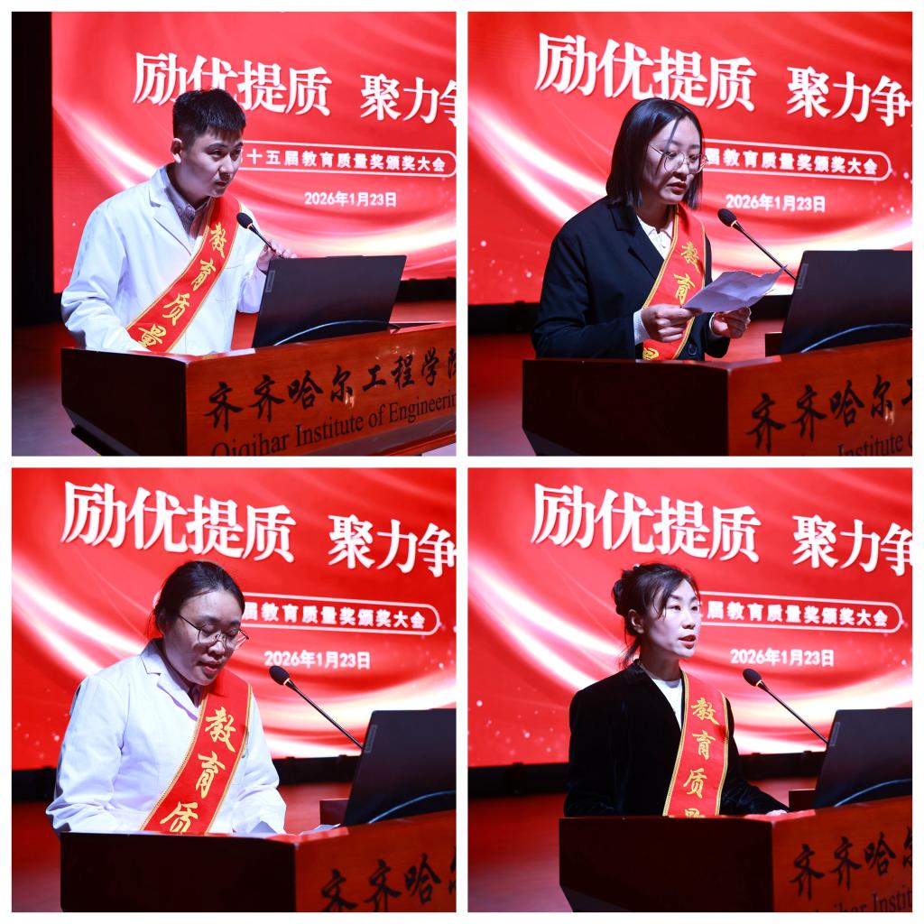 医学院院长孙强、机电学院教师贾文静、医学院教师曹慧、机电学院教师王虹作为获奖教师代表依次上台发言。教师们首先向学校给予的肯定和激励表达了诚挚感谢,并结合各自的教学与育人实践,分享了在讲台上潜心耕耘、在育人道路上持续探索的体会与感悟。他们表示,将以此次获奖为新的起点,始终恪守教育初心、强化责任担当,不断提升专业素养与教学能力,自觉践行教育家精神,助力学生全面成长成才,为学校高质量发展贡献力量。