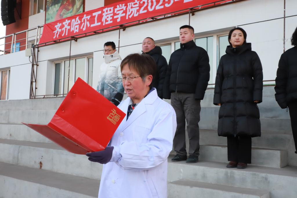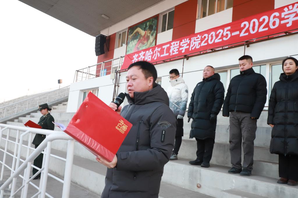 陈景鑫作总结讲话。她首先向全体师生致以新学期的问候与祝福,回顾学校发展成果的同时,结合“爱自己”这一网络热词,向全体师生提出三点殷切希望:一是以德立身,做信仰坚定的齐工程人。要坚守人生底色,在奋斗中锤炼品格、砥砺意志二是以能立业,做本领高强的应用型人才。要勤学善思、知行合一,不断提升专业素养与实践能力,主动对接社会发展需求三是以声传情,做校园形象的优秀传播者。要积极讲好齐工程故事,传播校园正能量,让更多人了解学校、认同学校、热爱学校。她号召全体师生以梦为马、不负韶华,凝心聚力、奋发作为,共同书写学校高质量发展的崭新篇章。