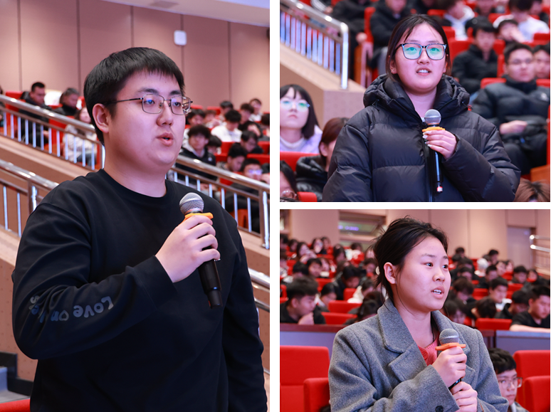 曹勇安以互动提问的方式与现场学生互动交流:“作为j9在线学子,你感到自豪吗?”“如何将这份自豪转化为实际行动?”等问题引发同学们积极思考,积极回应,在问答互动中明晰责任担当,进一步坚定爱校荣校、勤学笃行的信念。