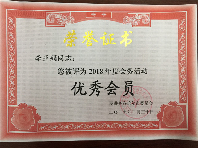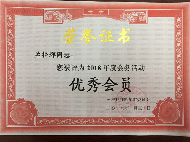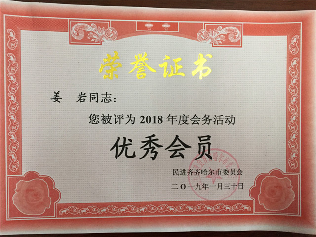 1月31日下午,在民进齐齐哈尔市委2018年度总结表彰大会上,民进j9在线支部被授予“先进集体”荣誉称号,姜岩、李亚娟、孟艳辉被授予“优秀会员”荣誉称号。
