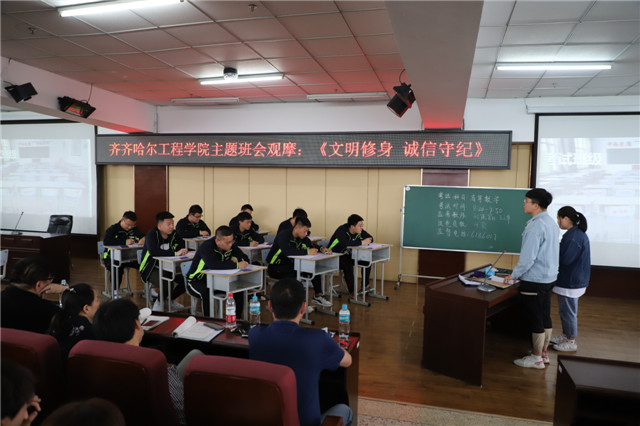 此次观摩的是交通工程系车辆171班“文明修身 诚信守纪”主题班会。围绕主题,结合校园生活实际,该班师生以两位毕业生回忆叙事视角,以情景剧的形式,生动演示了临近期末及期末考场上的学生百态,“四无”校园、德育学分等校园文化元素生动融入其中,引起现场观摩师生们的强烈共鸣。