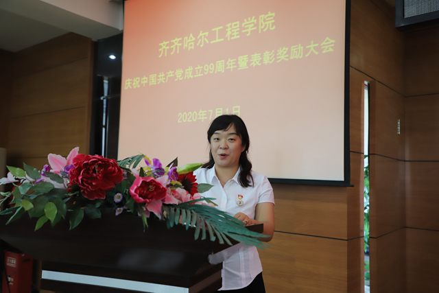 思政教学部教师、优秀党员赵婷婷代表受表彰先进集体和优秀个人作表态发言,决心坚定理想信念、不忘教育初心,加强党性修养、时刻努力学习,严于廉洁自律、做好本职工作,在今后工作中充分发挥共产党员的先锋模范作用。