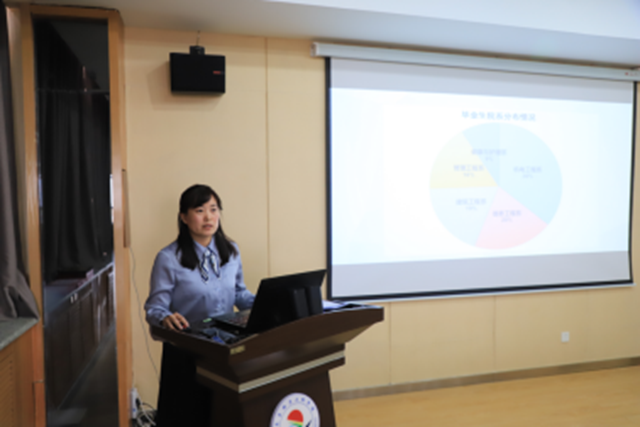 康静在会上做2020届毕业生就业工作报告,针对毕业生就业单位行业流向、就业地区流向、专业对口率、满意度做数据分析。