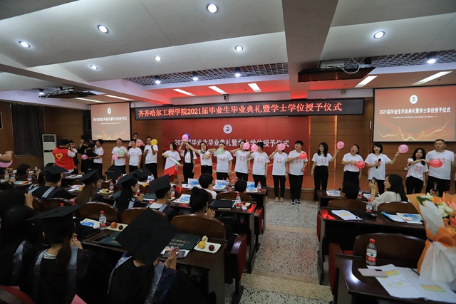 典礼过程中,全体毕业生共同合唱歌曲《再见》,用歌声回忆大学的种种美好,表达对母校依依不舍的眷恋之情。在学校各个岗位辛勤工作的教工代表通过视频,对2021届毕业生进行了祝福及寄语。