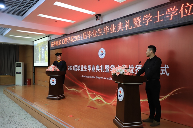 院长曹然彬宣读了《关于表彰2021年“优秀毕业生”的决定》,机电工程系车辆工程专业李友朵等71名学生被授予2021年“优秀毕业生”荣誉称号。工会主席、总会计师姜岩与副院长白雪为“优秀毕业生”颁发荣誉证书。