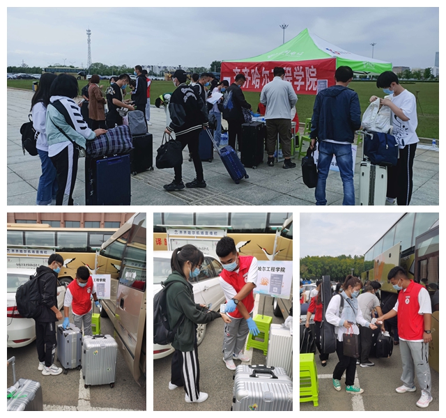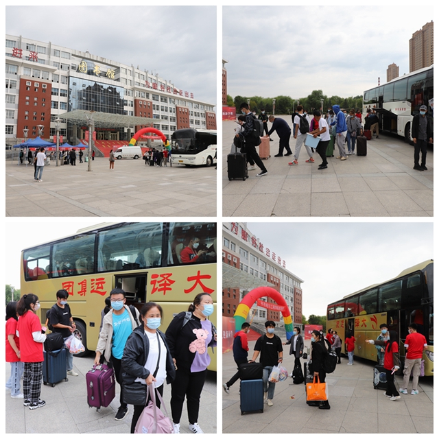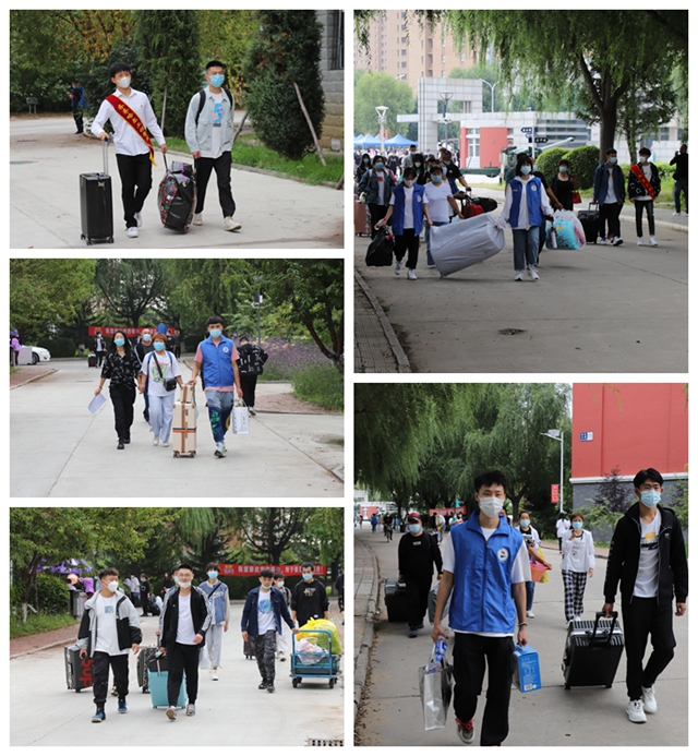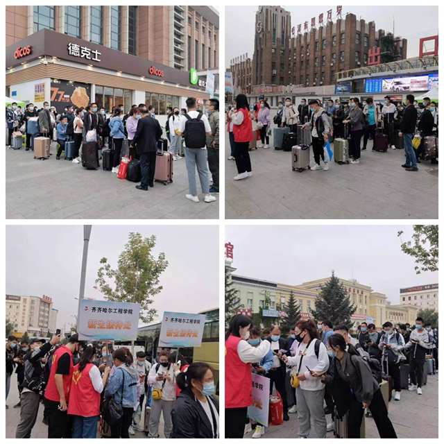 来自祖国各地的新大学生们分别从齐齐哈尔南站、齐齐哈尔站或三家子机场,乘坐学校安排的大 巴车来到校园门前,经过“一测、二查、三检、四住”的流程。即测体温、查验行程、检测、公寓报到,有序进入校园。