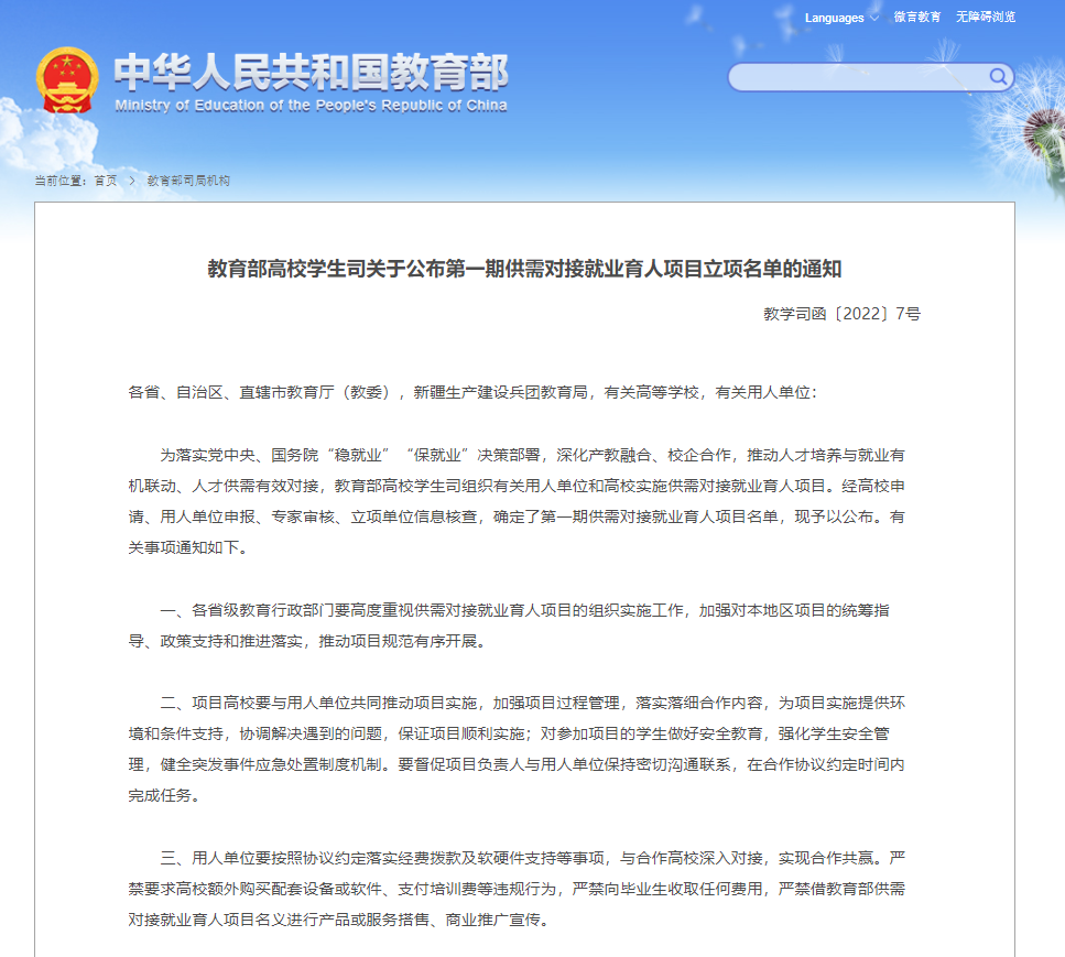学校此次入选的教育部第一期供需对接就业育人项目,是贯彻落实党中央、国务院“稳就业”“保就业”决策部署,深化产教融合、校企合作的实际行动,为学校推动人才培养与就业奠定了基础。