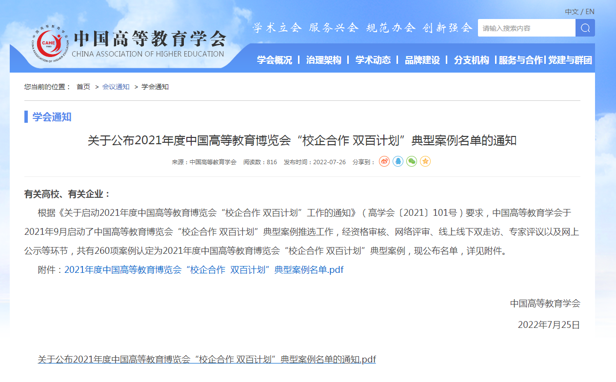 为深化产教融合、校企合作,促进教育链、人才链、产业链、创新链有机衔接,中国高等教育学会于2021年9月启动2021年度中国高等教育博览会“校企合作 双百计划”典型案例推选工作。