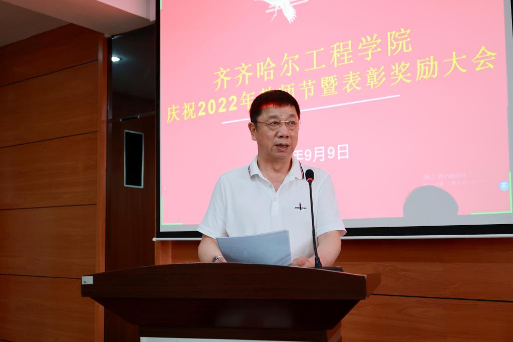 曹理事长回顾了学校在研发四真三化(FT)应用型课程开发工作坊、专业建设、第20个工程实践学期,学校和教师在国家级各类专业、行业获得的荣誉,充分肯定了广大教职工潜心教学、培育人才、服务社会取得的成绩,就进一步促进学校教育事业发展提出了三点要求:一是立足教育本职,紧扣主线、挖掘典型,丰富课程思政案例,讲好齐工程故事,献礼党的二十大;二是完善教育质量奖评价机制,有效发挥机制作用,教学、育人奖项双管齐下;三是继续深化教育教学综合改革,以课程建设为中心,以“大思政”为关键词,深耕细作、改革创新、有所突破,在铸魂培根上进一步发展。希望全体教师始终牢记为党育人、为国育才的使命,成为习近平总书记期待的“大先生”,拥有修身立德、以生为本、诲人不倦的育人情怀,爱岗敬业、勇于创新,在铸就齐工程辉煌灿烂的同时实现自身的价值和幸福。