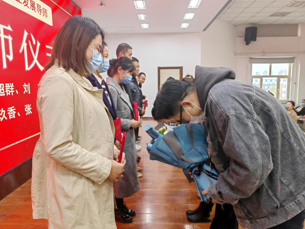 在拜师仪式上,新教师代表手捧鲜花敬献导师,不仅表达了对导师的敬意,也表明了个人学习的决心。