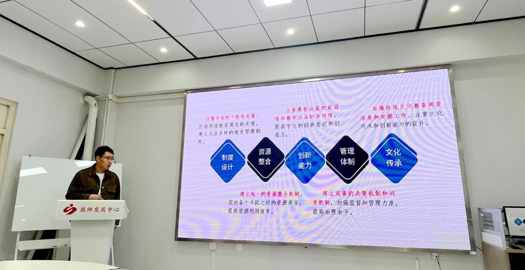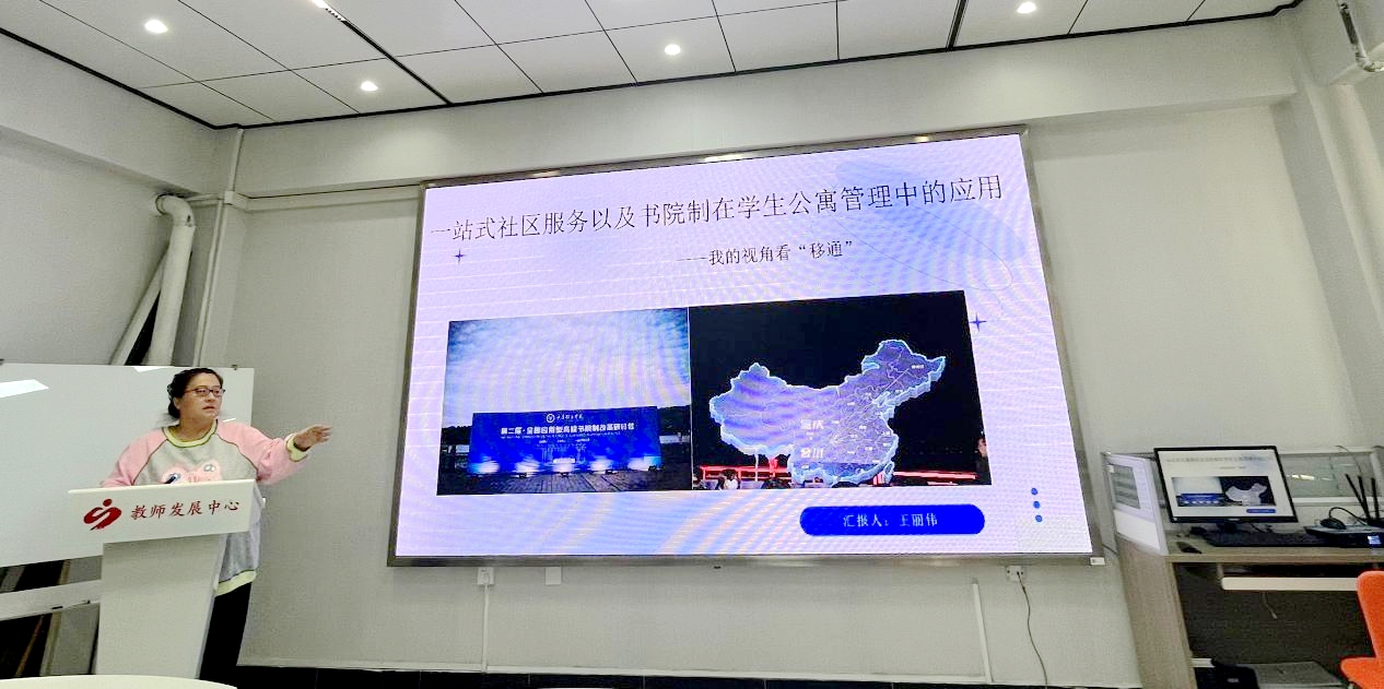 管理工程系副书记王丽伟以《一站式社区服务以及书院制在学生公寓管理中的应用》为题进行发言,通过介绍书院制的起源与发展及书院制在高等教育中的作用谈了之前对书院制的理解,参观移通学院的书院有了新的认识,认为依据现有条件先动起来,微改变是“大成功”的前提;课堂内外同等重要,要以学生需求为中心,让学生觉得舒服,有“家”的感觉,认同“家”文化。