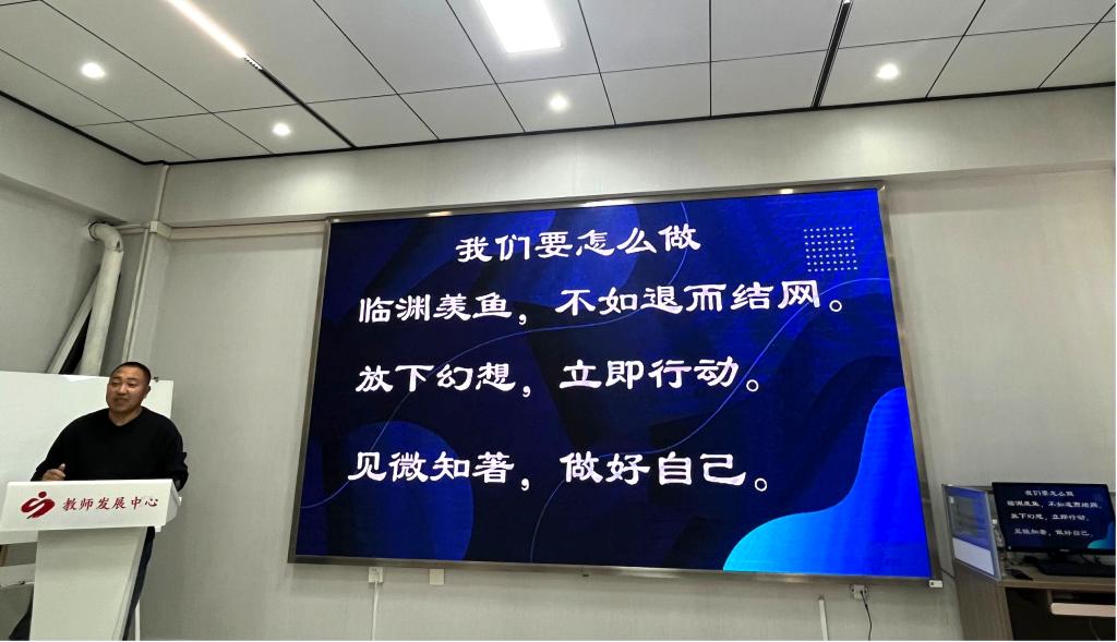 机电工程系副书记郭明敬以《相互守望 共同成长》为题发言,郭副书记以周远教授报告为例,认为把每项文件都解读透彻至关重要,认为学生工作既要有情义也要有情怀,既要有温度也要有高度,既要有爱心也要有责任心。