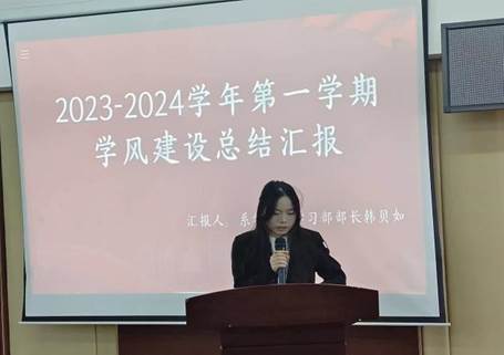 系学习部部长韩贝如对本学期的学风建设工作情况作了详细汇报,主要包括奖学金评定情况、早自习出勤情况、字帖检查评比情况,考试前注意事项,以及考研扶持等政策进行解读。