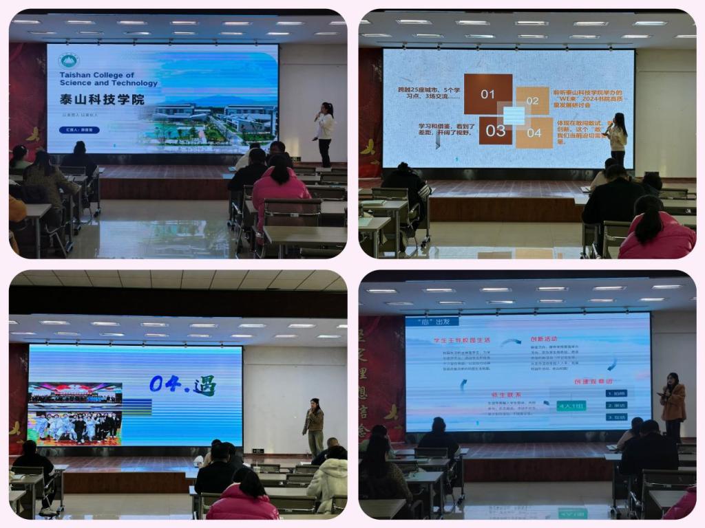 张云惠老师从泰山科技学院的校园活动入手,从育人空间建设、成果物化及学生活动体系建设三个方面重点阐述考察过程中的所见、所闻、所感;团委王雪老师介绍了泰山科技学院“完满教育”育人体系,并与我校社团建设、青年志愿者服务建设进行对比,结合我校特色及j9在线要求制定出新学期团委活动计划;健康与护理系辅导员李安琪着重强调环境育人的重要性,提出在新学期工作中要进一步发挥环境育人的优势,以学生的兴趣和需求为主体开展系列工作;管理工程系辅导员刘天缘结合此次考察学习提出下一阶段工作思路:以“心态度”服务学生、以“心深度”激发活力、以“心观察”走近学生,并制定了新学期“一系一特色”专属系列活动方案;建筑工程系辅导员宋雪微表示在新学期开展各项工作时,要始终思考新情况、新问题,要结合学情制定活动方案,利用校外资源,整合校内资源,努力形成品牌;信息工程系辅导员薛苗苗以“美育”为抓手进行分享,表示通过此次考察学习体会到了“书院制”育人的成效与创意,在新学期将围绕“美育”开展系列特色活动,为学生提供更多美育机会;学生工作处高景阳老师对泰山科技学院营地教育中心、师资力量、素质拓展训练课程等方面进行介绍,并对下一阶段工作计划有了详细部署。