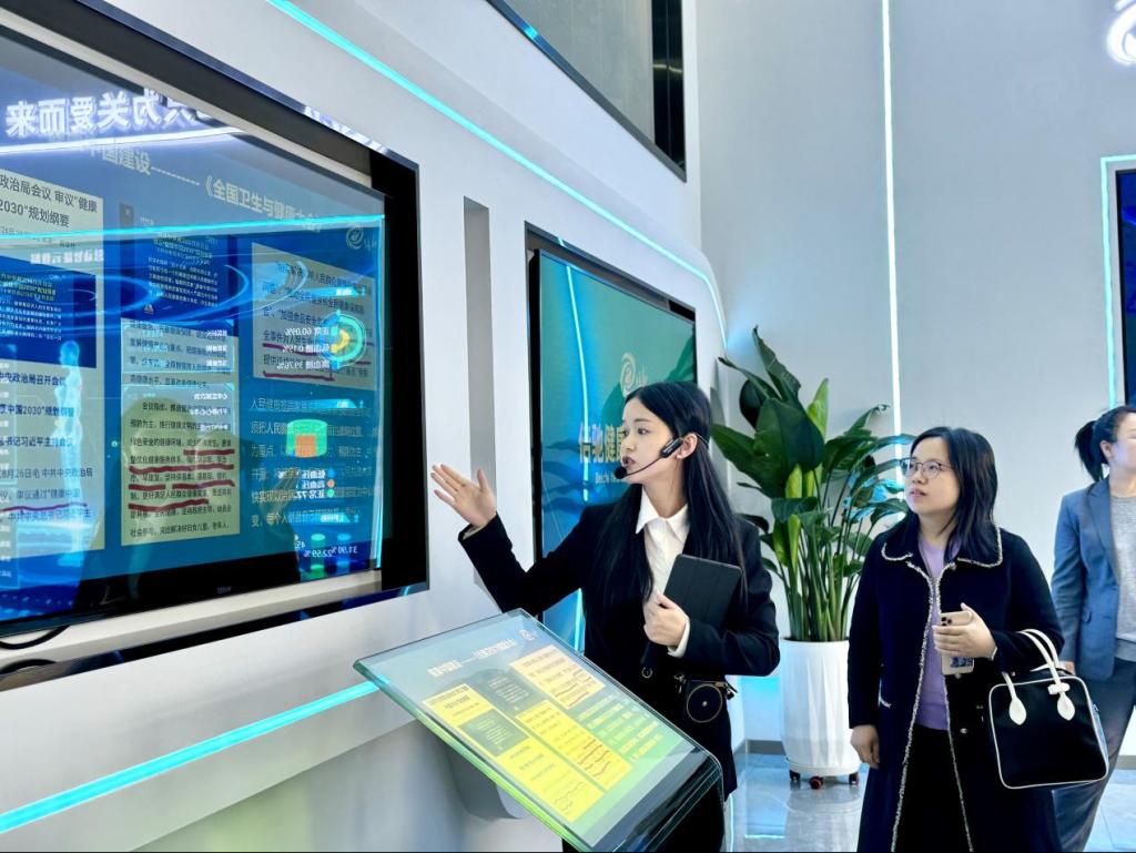 随后,哈尔滨安驰健康管理公司总经理佟宝华带领师生们来到数据管理中心。展示了安驰营动智能云数据的应用模式,客户通过智能穿戴设备——智能手表进行健康监测,数据实时传输给健康管理师或客户。同时,了解了安驰的悦享365健康管理方式、客户减重管理方案成果、营动智能技术健康管理流程,体验了抗阻循环训练器等设备。