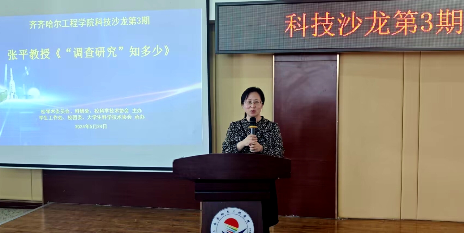 5月24日下午,由学校学术委员会、科研处、科学技术协会主办,学生工作处、校团委、大学生科学技术协会承办的第3期科技沙龙在图书馆501报告厅举行。本期科技沙龙邀请科研处副处长张平教授作题为《调查研究知多少》的专题报告,来自各系的近200名学生参加。