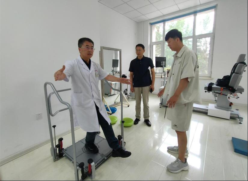 随后,臧克成带领调研团队来到运动康复大厅,并亲身演示静态平衡仪的使用,该平衡仪可以增强患者下肢肌群的离心控制能力,提高患者站立平衡及动态平衡能力。