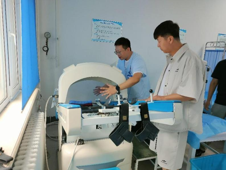 理疗科负责人带领调研团队走进了理疗室,现场展示了热磁横波运动理疗机的操作过程,该款理疗机采用刺激人体穴位、促进血液循环的原理,有效治疗腰椎间盘突出、腰肌劳损等常见病症。