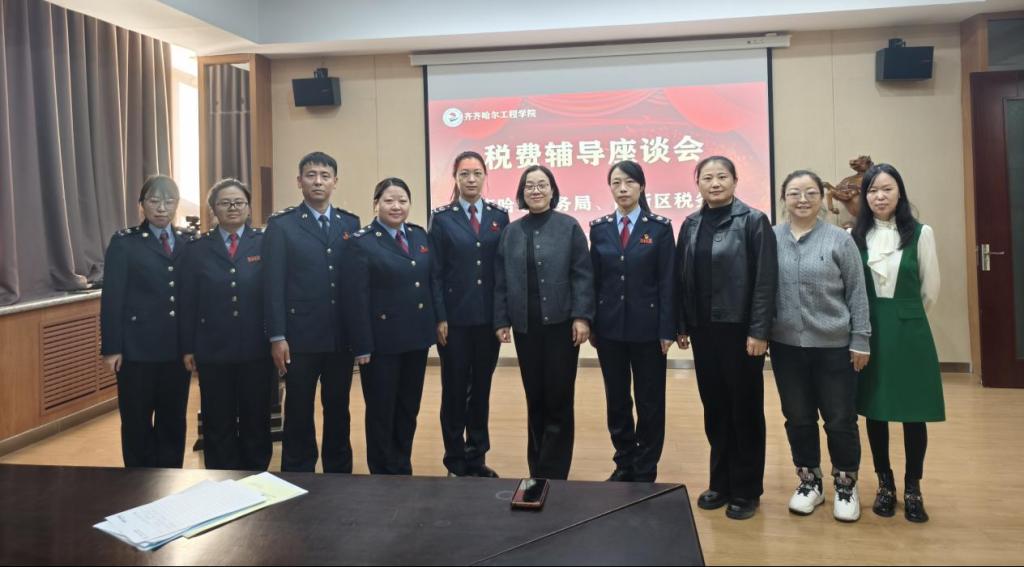 1121日上午,齐齐哈尔市税务局、高新区税务局一行六人来校开展税费指导工作,学校理事姜岩带领财务处全体人员参加座谈会。
