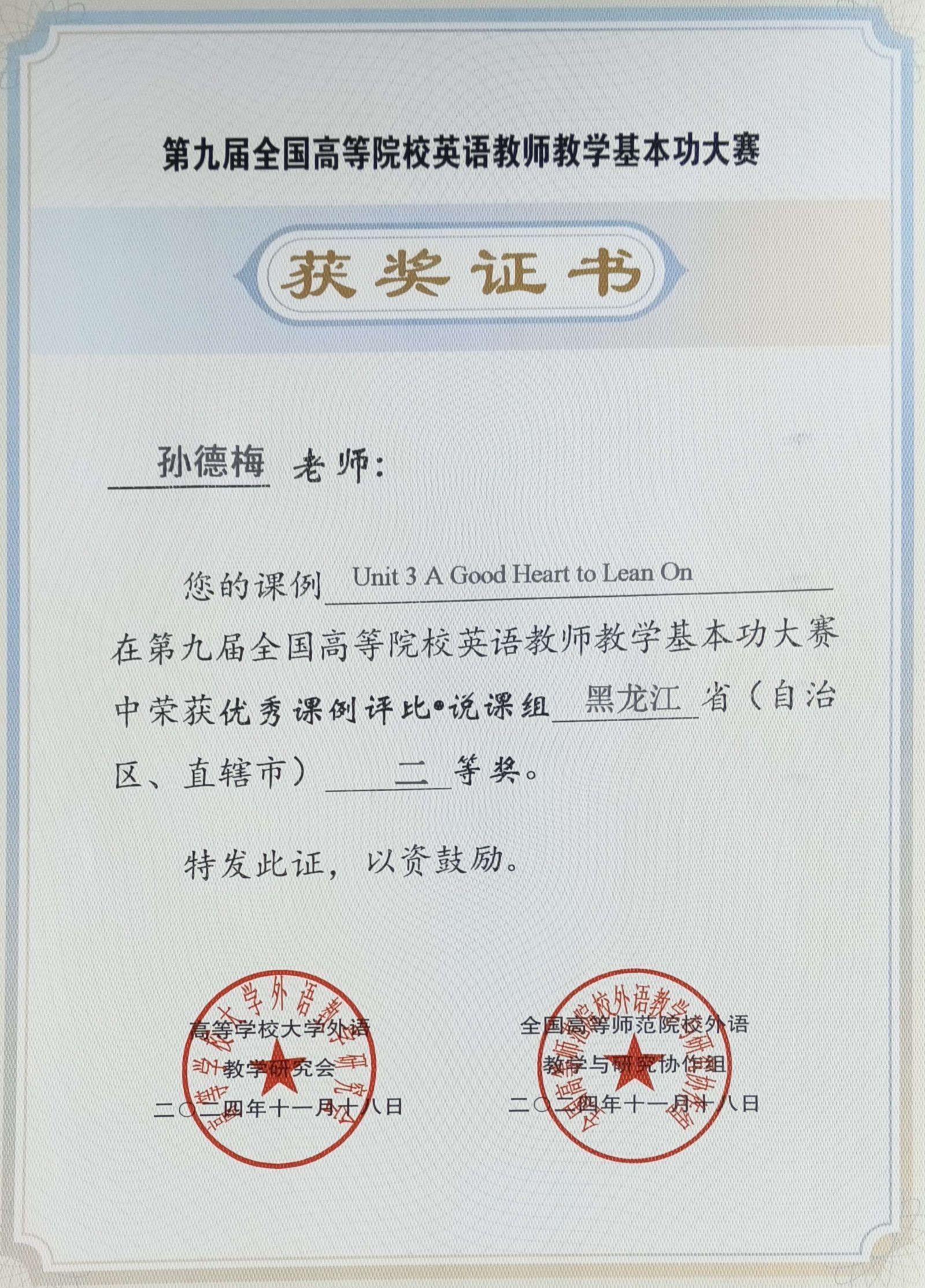 本次大赛是专门针对高校英语教师的全国性专项教学赛事,大学外语教研室教师积极参与。其中,孙德梅荣获优秀课例评比•说课省级二等奖,刘欢、马私阳、孙伟、曹献玲、鹿惠敏荣获优秀课例评比•说课省级三等奖,刘双丽、李爽和孙婷婷均荣获优秀课例评比•实录课省级三等奖,徐怡、齐锐教师团队荣获优秀课例评比•微课省级优秀奖。