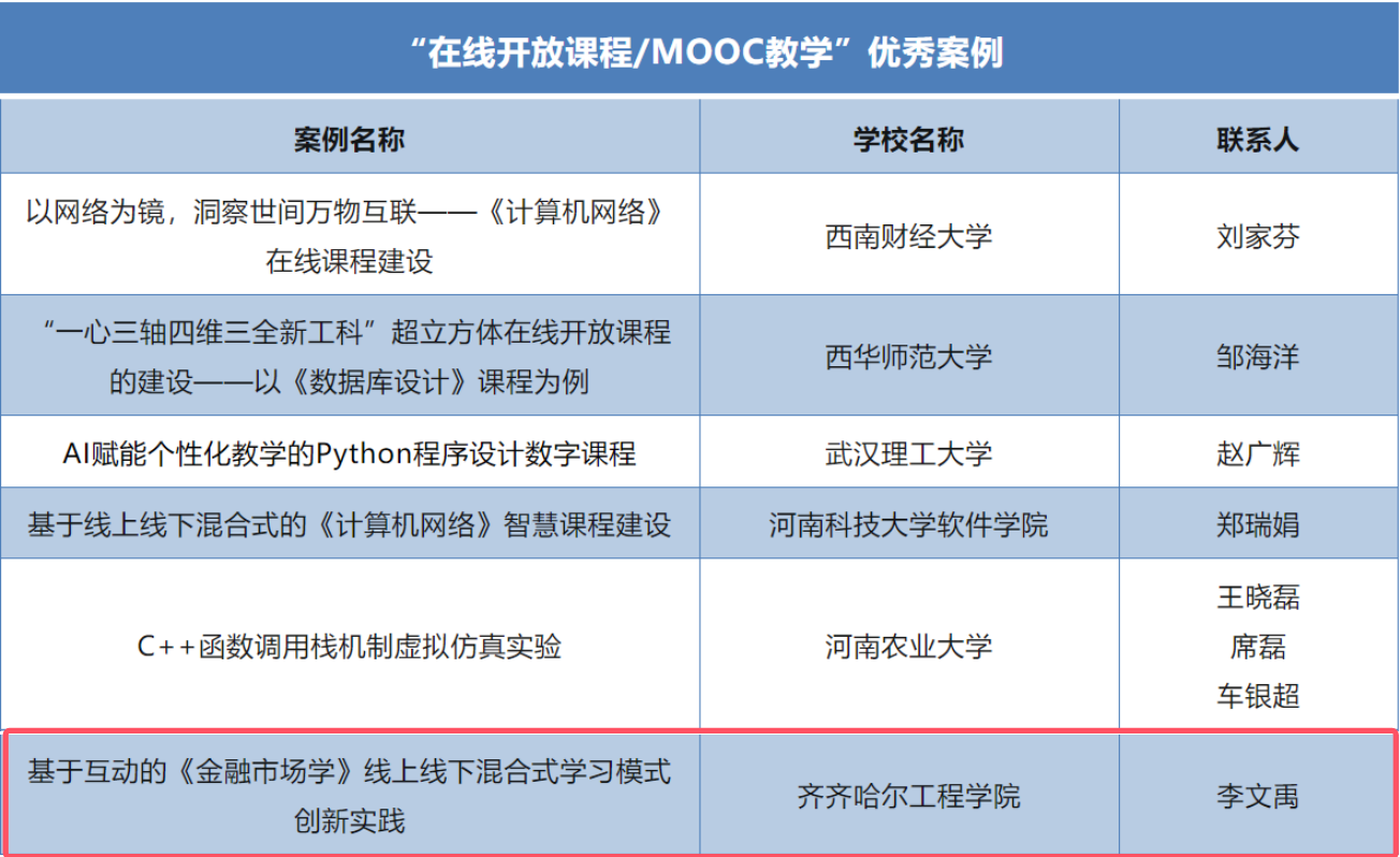 12月22日,高校在线开放课程联盟联席会公布2024年度“在线开放课程/MOOC教学”优秀案例名单,学校李文禹老师依托“四真三化(FT)”课程建设模式而开发的《基于互动的<金融市场学>线上线下混合式学习模式创新实践》案例成功入选。