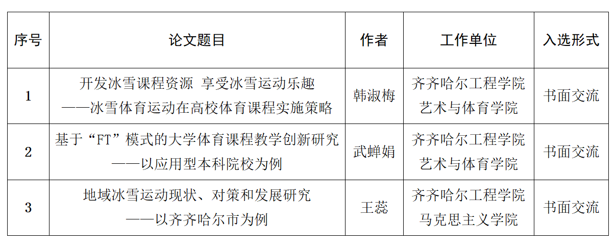 近日,“黑龙江省第十九届学生运动会科学论文报告会”(以下简称科报会)传来喜讯,我校教师韩淑梅、武蝉娟、王蕊撰写的论文作为书面交流材料入选大会。