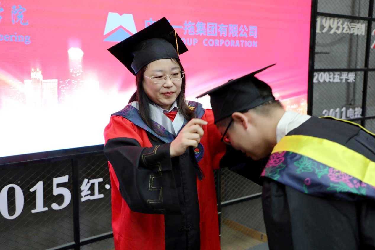 伴着《加冕进行曲》的音乐,二期专班毕业生依次走上台,张静、敖林喆、大拖公司人力资源部部长苏海龙、中小托公司企划部部长尚光旭、柴油机公司综合管理部部长王琳、福莱格公司人力企管部部长李楠、收获机具公司综合办公室副部长方星光上台为毕业生们正衣冠、扶正流苏、颁发学士学位证书。
