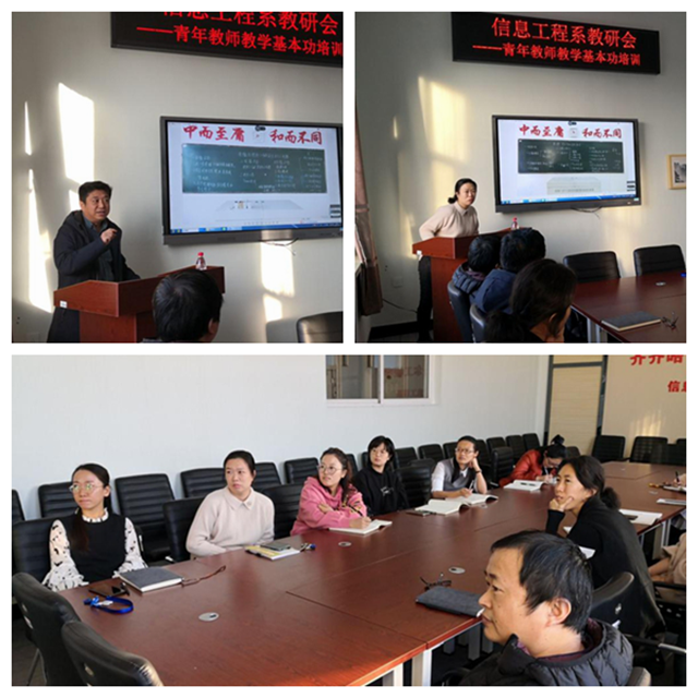 1218日下午信息工程系召开教研会,由系主任武传宝、教学工作副主任刘春媛系二级督导王智慧、姚旭、洪学银针对各位青年教师的板书设计内容提出指导意见和建议,强调对实验课程,板书内容可提前准备好,更直观地向学生展示实验的目的、实验步骤和实验内容对理论课程,板书内容要做到随写随讲,列出图形、图表,并可采辅助性教学手段。