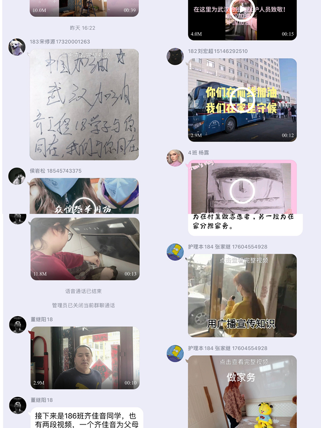 “隔离不隔爱”,护理学专业2018级的同学们近来在QQ群中分享了近百个小视频,通过互联网、新媒体等平台传递大学生在家防控疫情的正能量,表达对疫情的关注、祝福或假期生活中点点滴滴的感谢、感悟。