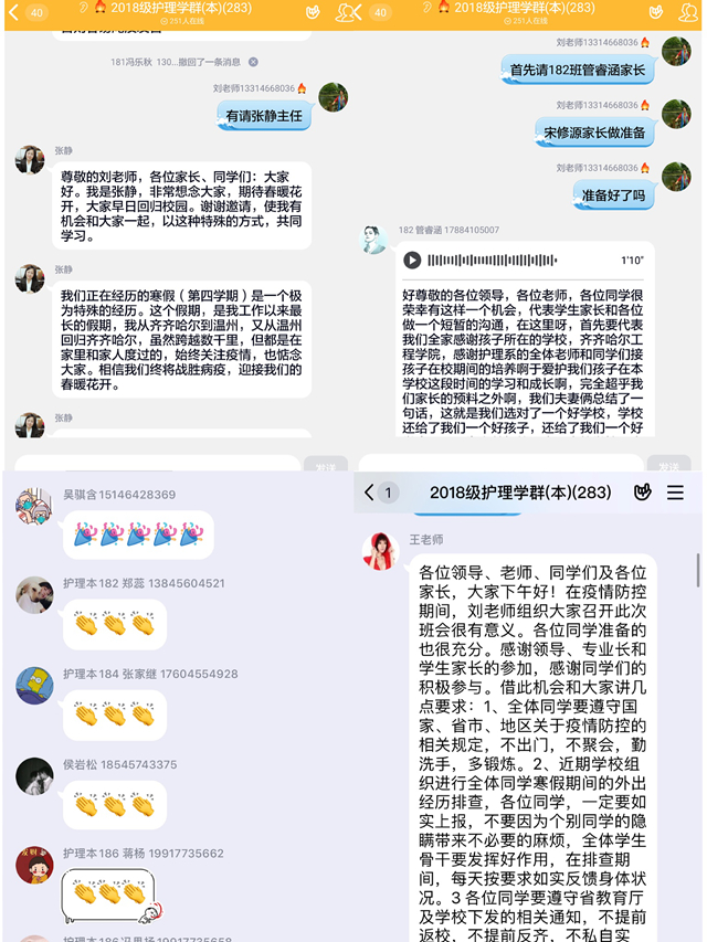 为引导学生们正确对待新冠肺炎疫情,增强抗击疫情的信心,同时有意义地度过后续居家时间,给下一步可能展开的网络教学打基础、做准备,2月12日下午,健康与护理系护理学专业通过QQ群召开2018级“班会键对键 战疫心连心”网络主题班会。