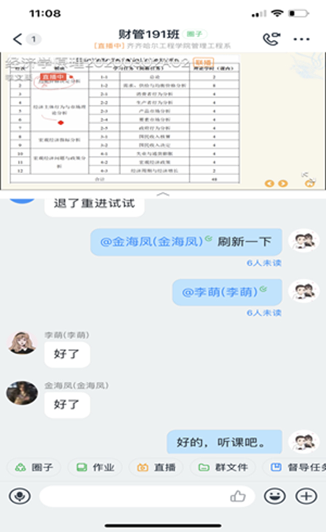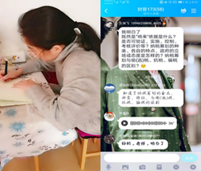 财务管理专业2018级兼职辅导员郭慧莹,这天从早8点至下午3点,对4个班级的1门专业课、2门公共课程进行了全程跟班听课。听课过程中她看到,公共课在“学习通”平台上由于网络问题较为卡顿,但学生们听从教师的安排,在“学习通”平台的班级群里进行互动,完成正常的教学;专业课主要运用钉钉直播方式进行授课,软件平台的运行及课堂教学效果都较好。