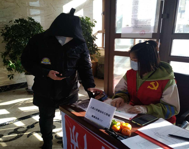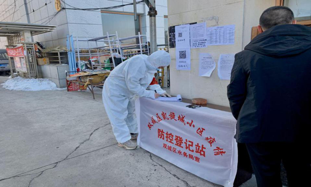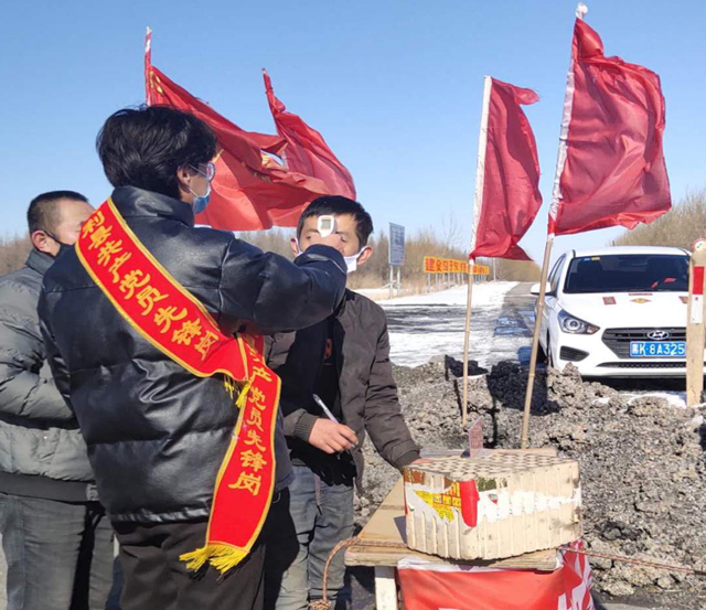土木191班团员耿闯在哈尔滨市双城区做疫情防控志愿者,主要工作是来往人员进行信息登记。