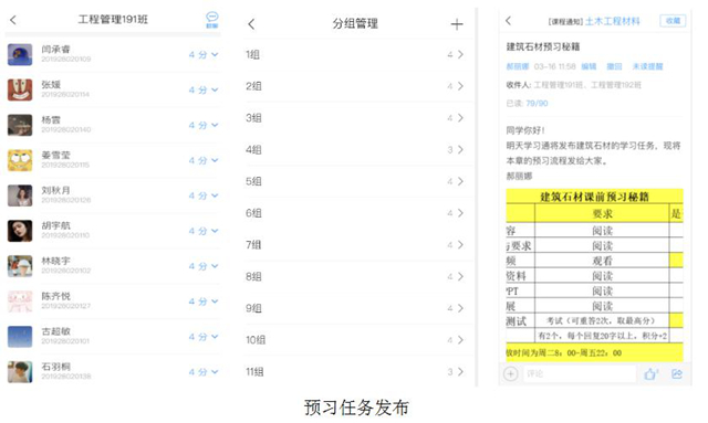 郝丽娜老师合理选择教学平台,邀请所有学生加入学习通课程班级,并分成若干学习小组。为避免教学中平台出现卡顿,提前做好应急预案,建立了QQ群课堂。通过学习通平台发布“学习目标卡”“学生预习指南”和“土木工程材料学习秘籍”,更好地帮助学生开展自学。