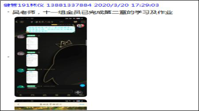 3、课下——学习通+qq监督指导。帮助学生养成良好学习习惯——学生习惯的养成需要一个从“他律”到“自律”的过程。线上学习,需要教师帮助学生从“他律”顺利过渡到“自律”。因此,我将学生分成14个组,以小组为单位进行学习,并采取组内互相监督的模式,每周五由组长汇报本组学生学习情况、学习任务完成情况,对未按规定时间完成学习内容的小组进行惩罚,以此督促学生,形成长效监督机制: