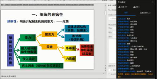 五是课程思政自然融入课程。例如讲到“病原菌侵入机体能否致病,与细菌的毒力、侵入机体的微生物数量、细菌的致病作用与其毒力、侵入机体的微生物数量、侵入途径及机体的免疫状态、环境因素等密切相关”时,通过讲病原体侵入机体能否引起感染还取决于“机体的免疫力的高低”引出课程思政。通过让学生思考“免疫力的高低与什么有关系”,引出对健康的生活方式的倡导。