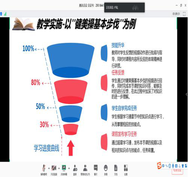 卢凤老师以组织开展线上“健美操”体育项目为例,分享了在线教学过程中师生共成长的故事,展现了体育在线教学的“风雨”和“彩虹”。学生从开始的被动接受到后来的积极参加和反馈感受,作为教师也从在线教学平台的运用和慕课教学中收获了自我成长。