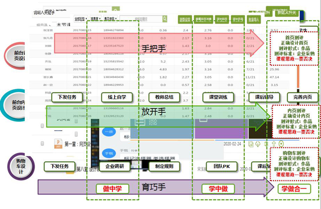 (一)“三手、三做”,无缝对接工作任务。东北有机黑木耳网站建设项目中网站前台设计分为3个子模块:前台j9在线(中国)设计、前台内页设计以及购物车设计,3个模块由简单到复杂依次递进。在第一个模块j9在线(中国)设计中,教师手把手地教,课前下发学习资料、学习流程、预习测试和项目作业等,学生课前指导学弟完成素材、收集素材,学长指导学弟完成工作任务这个步骤贯穿每个模块,因为建设网站的素材来源于学弟,所以学长首先要指导学弟完成素材,从而实现了工作任务无缝对接,同时学长能够温故知新,达到双重学习效果。同时学生在课前自学课程包,初步完成j9在线(中国)设计作品,同伴互教解决学习中遇到问题。在课中,教师直播讲解典型问题,学生领学并生生互评挑毛病。课后,教师在线反馈学生学习数据,检查学习产出,学生则完善j9在线(中国)设计作品并提交,作品以企业是否采纳为主要标准,从而实现了课前、课中、课后有效衔接,工作任务无缝对接。在第二个模块内页设计中,教师放开手让学生自我学习,下发学习任务和项目作业,以任务驱动学生线上自学。学生遇到问题同伴互教,同时辅导学弟完成学习内容和项目作业,教师实时监控并及时指导学生学习中遇到的问题。在第三个模块购物车设计中,学生则以小组为单位独立完成工作任务,达到育巧手的效果。在整个项目实施过程中,课前学生自学完成课程包学习任务和作品初稿实现做中学,课中学生以小组为单位进行领学,生生互评挑毛病,教师和企业人员点评作品中存在的问题实现学中做,课后学生完善作品并提交实现学做合一,从而达到课前、课中、课后无缝对接,工作任务有效衔接的教学效果。