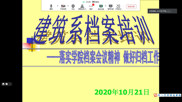 10月21日中午,建筑工程系兼职档案员李月凤老师在线对本系23名班级档案员进行档案工作培训。她为班级档案员介绍系档案工作的现状,结合实际强调档案工作的重要性及注意事项,详细讲解了档案的收集、整理方法及流程,与就班档案收集过程中的具体问题进行指导,希望班级档案员高标准高质量完成班级档案收集、整理及归档工作。